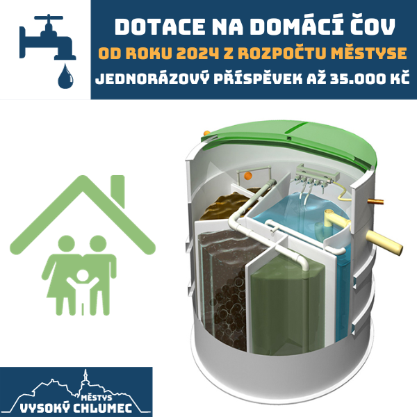 - Dotace se poskytuje na výdaje spojené se stavbou ČOV vybudovanou pro budovy sloužící k trvalému bydlení a pro občany městyse přihlášené k trvalému pobytu v zmíněných nemovitostech. Dotace se vztahuje na budovy nacházející se na území městyse Vysoký Chlumec v částechPořešice, Bláhova Lhota, Zvěstovice, Panská Tisovnice, Hrabří, Hradce, Jezvina, Vápenice a to za podmínky, že předmětnou nemovitost není možné napojit na veřejnou splaškovou kanalizaci.
